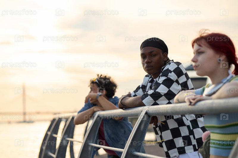 Молодые мультиэтнические друзья, опирающиеся на перила и наблюдающие за закатом солнца на свежем воздухе