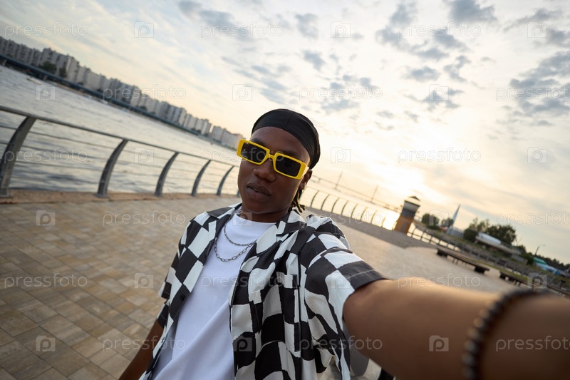 Портрет молодого чернокожего мужчины, делающего селфи на открытом воздухе возле набережной