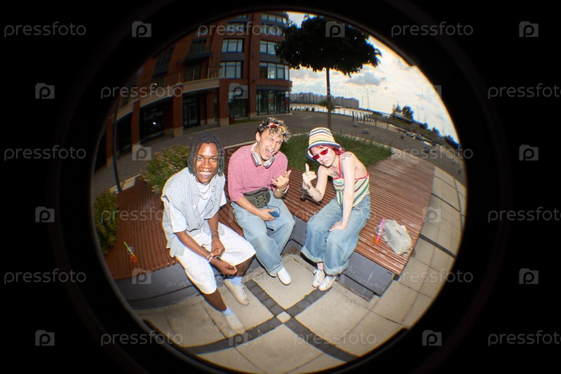 Разнообразные молодые друзья сидят на улице, смеясь и делая жесты вместе