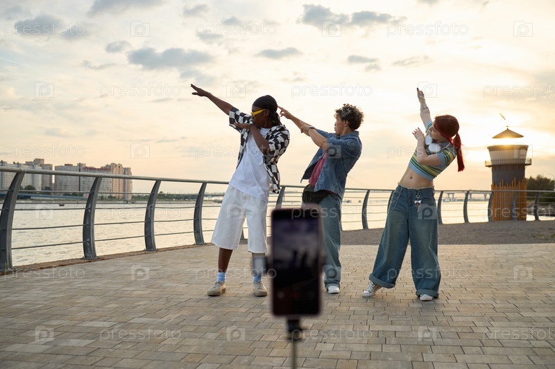 Группа разнообразных молодых друзей танцуют на свежем воздухе запись видео со смартфоном