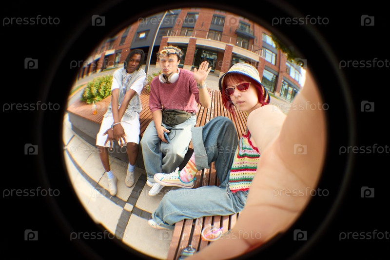 Портрет разных подростков, сидящих на улице и делающих селфи вместе