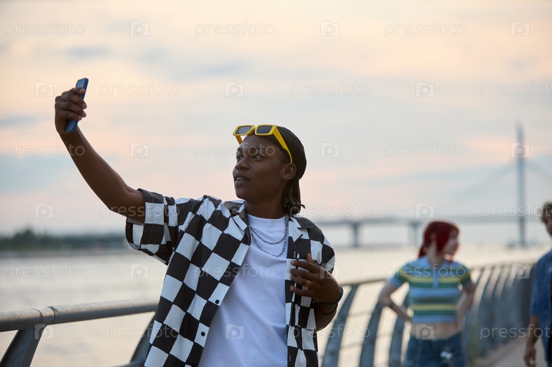 Молодой чернокожий мужчина делает селфи на открытом воздухе возле реки во время захода солнца