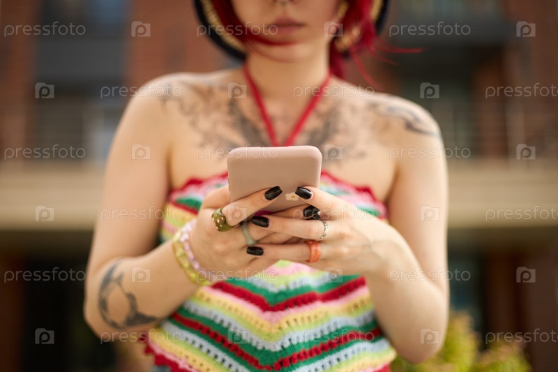 Молодая женщина с татуировками отправляет текстовые сообщения со смартфона на открытом воздухе