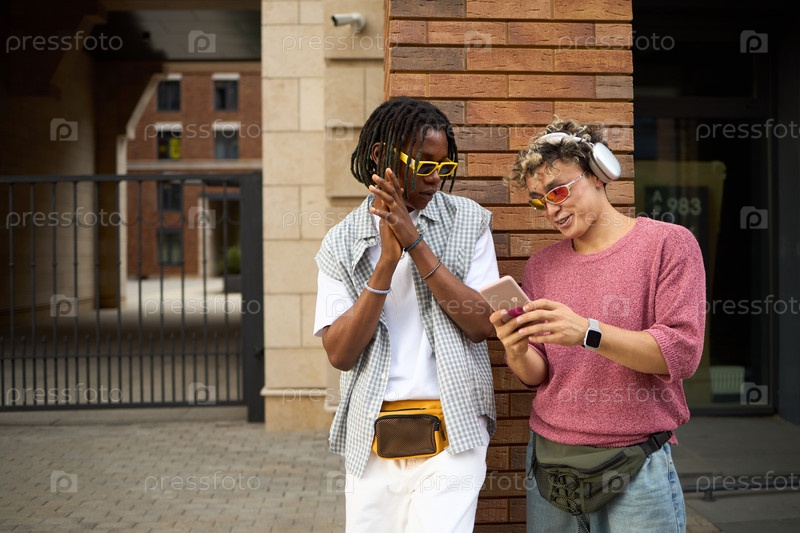 Молодые многонациональные друзья смеются, пока смотрят видео на смартфоне