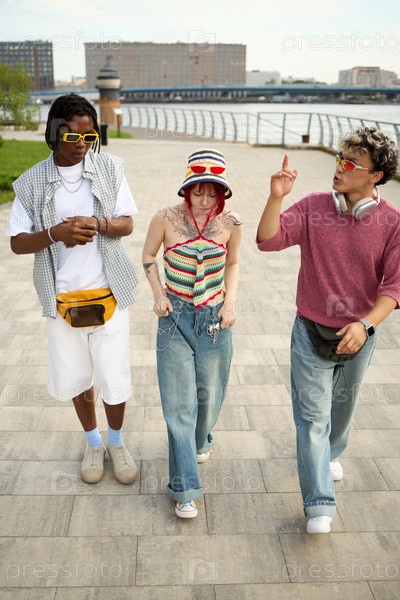 Мультиэтническая группа молодых друзей ходят на улице и разговаривают вместе