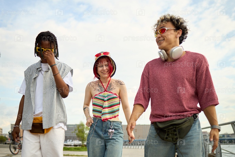 Мультиэтнические молодые люди, гуляющие на улице и улыбающиеся в солнечный день