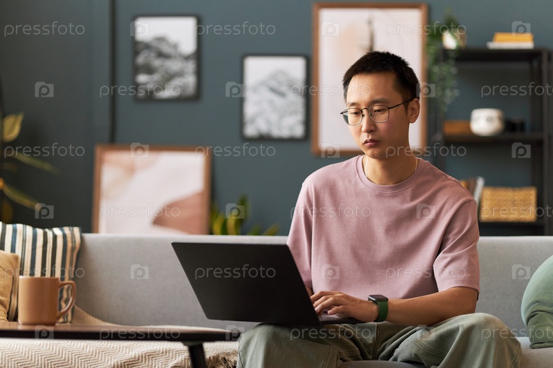 Молодой взрослый азиатский мужчина использует ноутбук, сидя на диване в современной гостиной