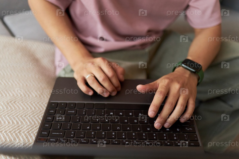 Молодой взрослый азиатский мужчина работает удаленно на ноутбуке, сидя на диване