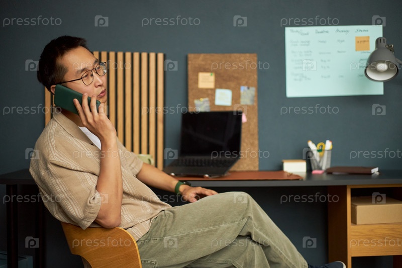 Молодой взрослый азиатский мужчина сидит в офисе и разговаривает со смартфоном за рабочим столом