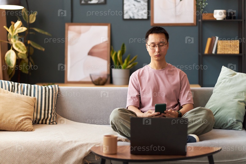 Взрослый азиатский мужчина сидит с крестовыми ногами молодой человек использует смартфон возле ноутбука