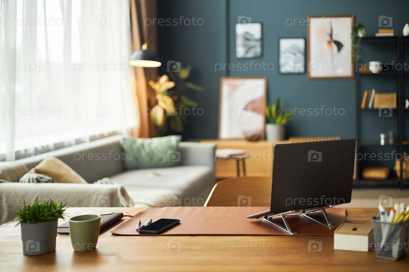Зал современного домашнего офиса с ноутбуком и смартфоном в уютной гостиной