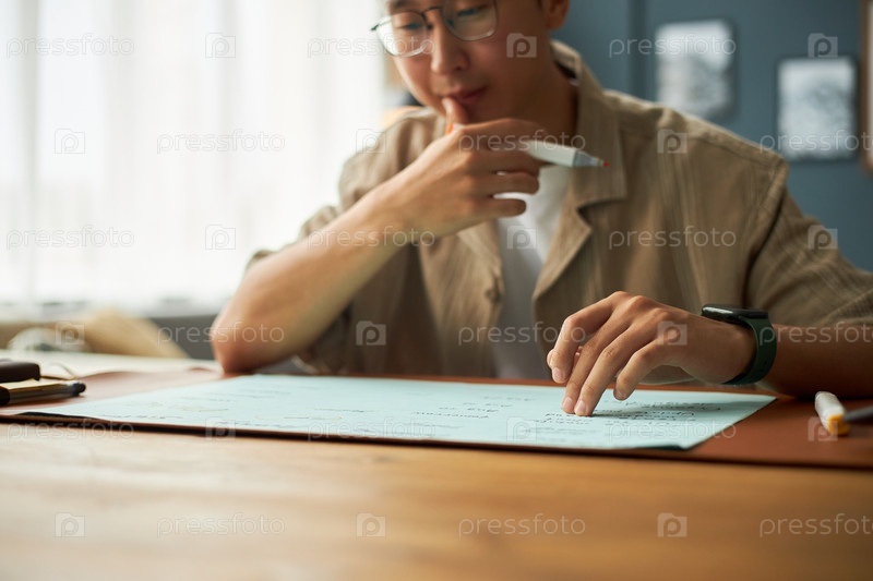 Молодой взрослый азиатский мужчина анализирует документы, сидя за деревянным столом