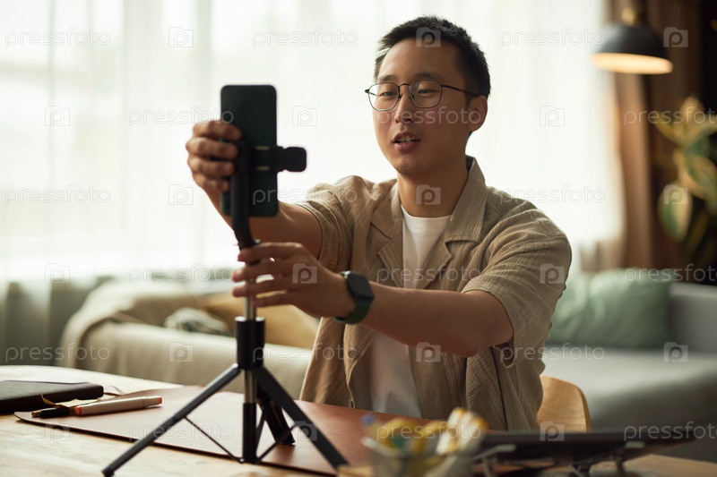 Молодой взрослый азиатский мужчина регулирует смартфон на штативе, работая в помещении