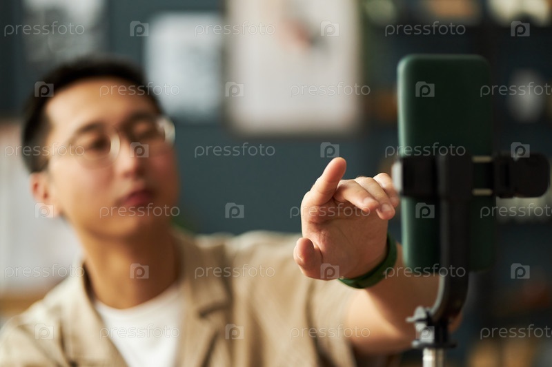 Молодой взрослый азиатский мужчина регулирует смартфон на штативе, записывая видео