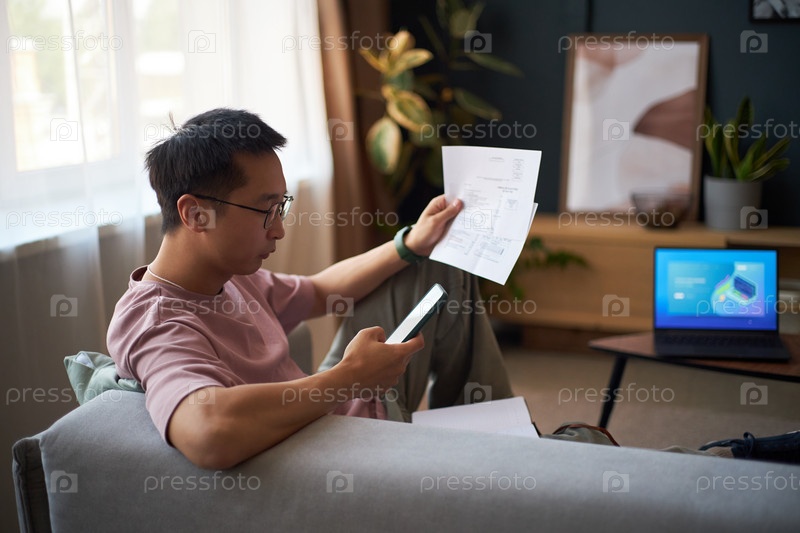 Молодой взрослый азиатский мужчина просматривает финансовые документы, используя смартфон
