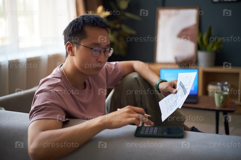 Молодой взрослый азиатский мужчина рассчитывает расходы, просматривая финансовые документы