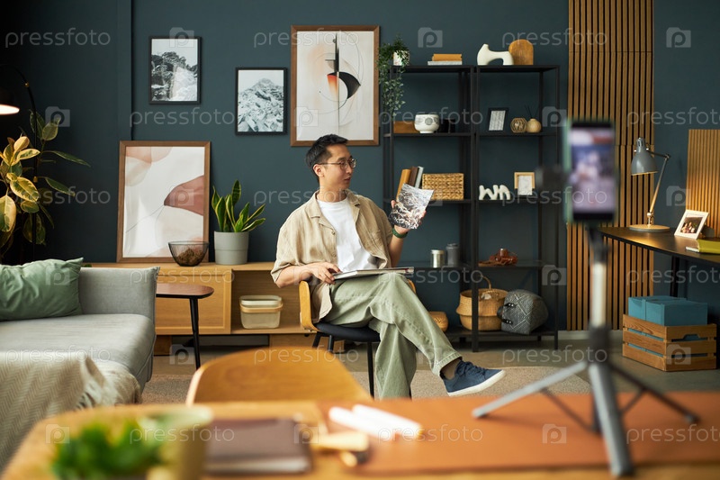 Молодой взрослый азиатский мужчина сидит в гостиной, записывая видео со смартфоном