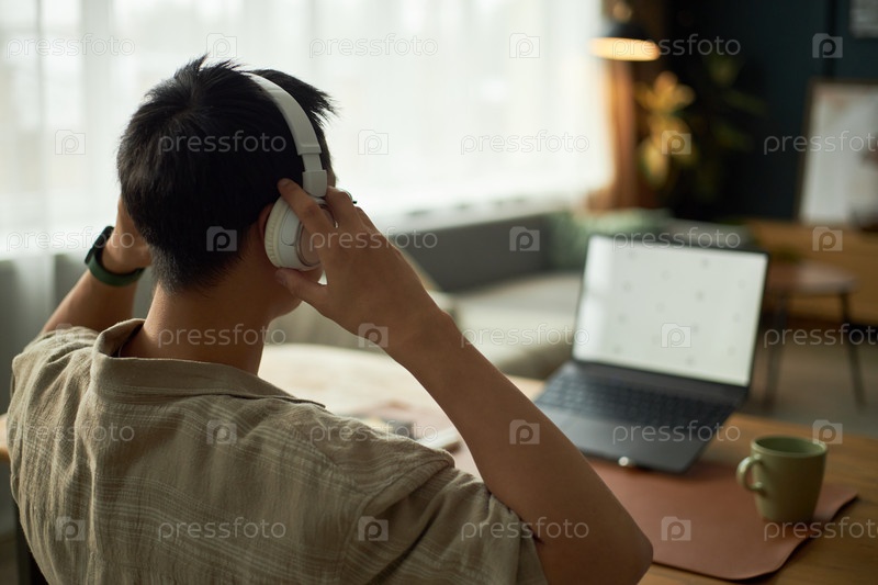 Молодой азиатский мужчина в наушниках слушает музыку, используя ноутбук