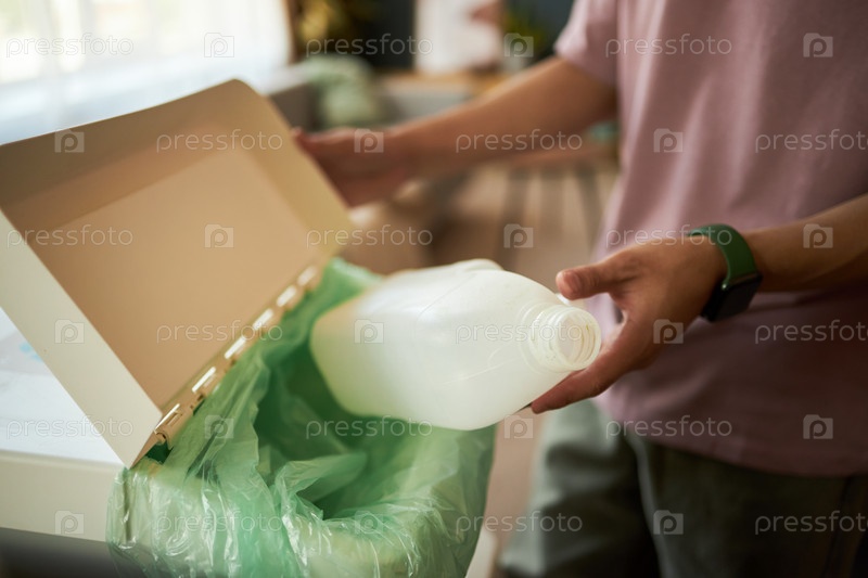 Молодой взрослый мужчина перерабатывает пластиковую бутылку на кухне