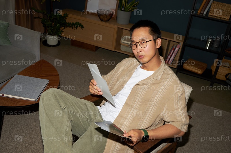 Портрет молодого взрослого азиатского мужчины, сидящего в помещении и внимательно читающего документы