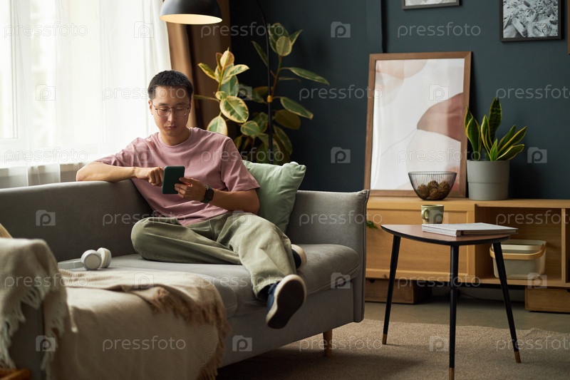 Молодой взрослый азиатский мужчина сидит на диване, используя смартфон в современной гостиной