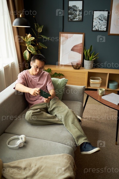 Молодой взрослый азиатский мужчина отдыхает на диване, используя цифровой планшет дома