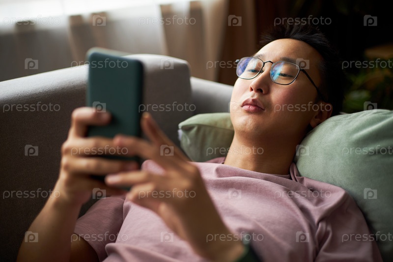 Молодой взрослый азиатский мужчина отдыхает на диване, используя смартфон в помещении