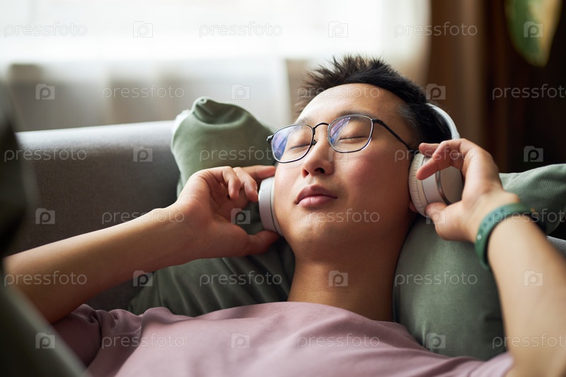 Молодой взрослый азиатский мужчина наслаждается расслабляющей музыкой, лежа на удобном диване