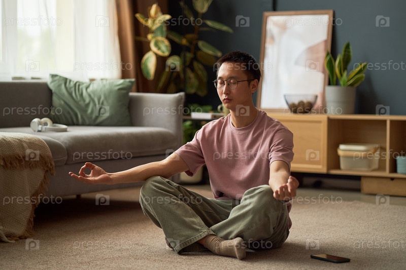 Молодой взрослый азиатский мужчина практикует осознанное дыхание медитацию сидение скрещенные ноги