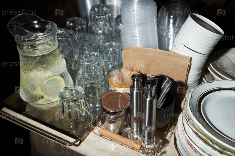 Накопленная стеклянная посуда и одноразовые столовые принадлежности, расположенные на столе Catering Service