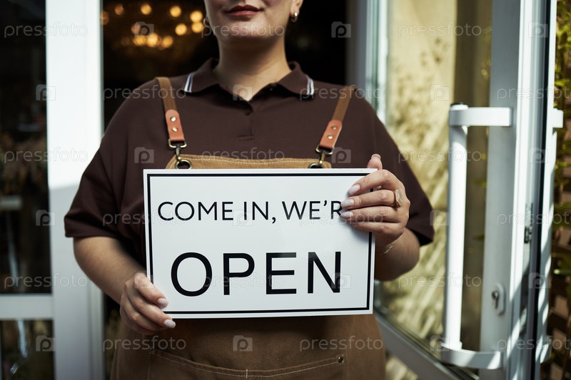 Молодая взрослая женщина держит открытый знак, стоящий снаружи витрины магазина