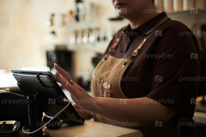 Молодая взрослая женщина работает с сенсорным экраном Регистрируйтесь в кофейне