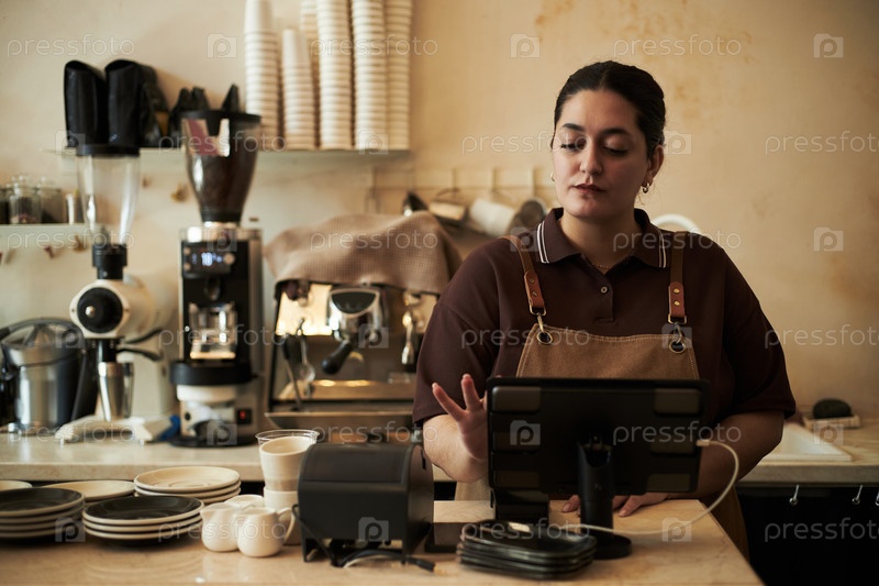 Молодая взрослая женщина работает с сенсорным экраном Регистрируйтесь в кофейне