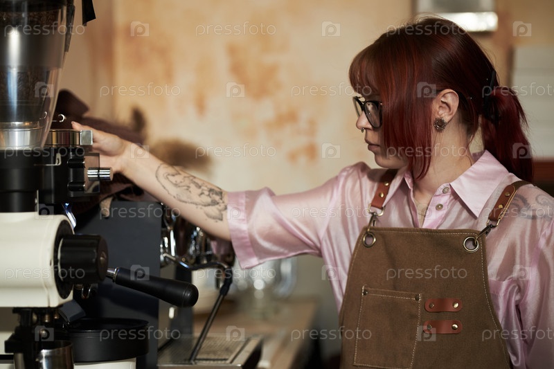 Молодая взрослая женщина управляет эспрессо-машиной в кофейне