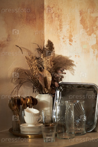 Устройства из сухой травы, стоящие рядом со стеклянной и столовой посудой в помещении