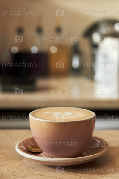 Чашка свежего кофе, сидящая за столом в кафе с размытым фоном