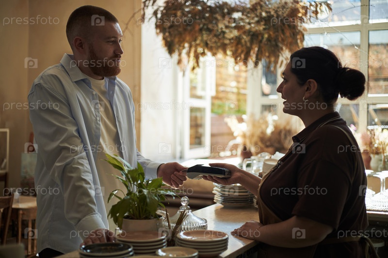 Молодой взрослый мужчина платит картой женщине средних лет в кафе