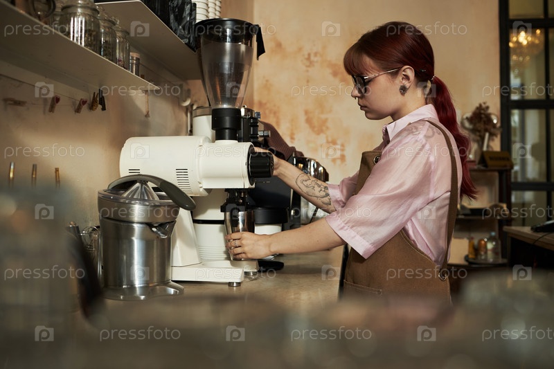 Молодая женщина готовит кофейный напиток с помощью профессиональной эспрессо-машины