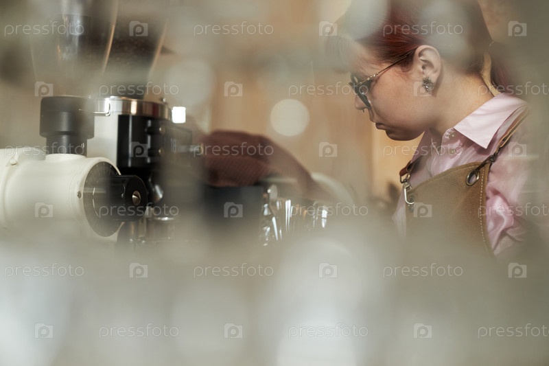 Молодая взрослая женщина работает с кофемашиной в окружении кафе