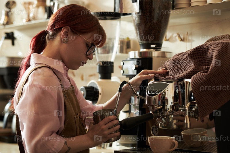 Молодая взрослая женщина готовит кофейный напиток с помощью эспрессо-машины
