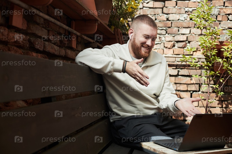 Молодой взрослый мужчина улыбается, пока жестикулирует во время видеозвонка на улице