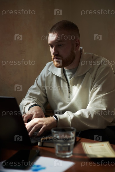 Молодой взрослый мужчина работает на ноутбуке за рабочим столом при естественном свете