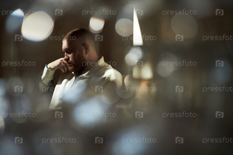 Молодой взрослый мужчина сидит один, размышляя в задумчивом настроении