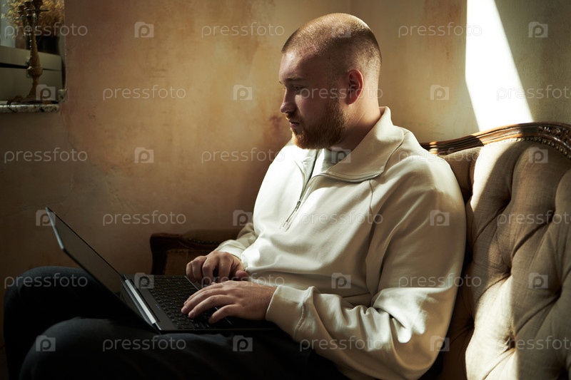 Молодой взрослый мужчина сидит в помещении, используя ноутбук для работы