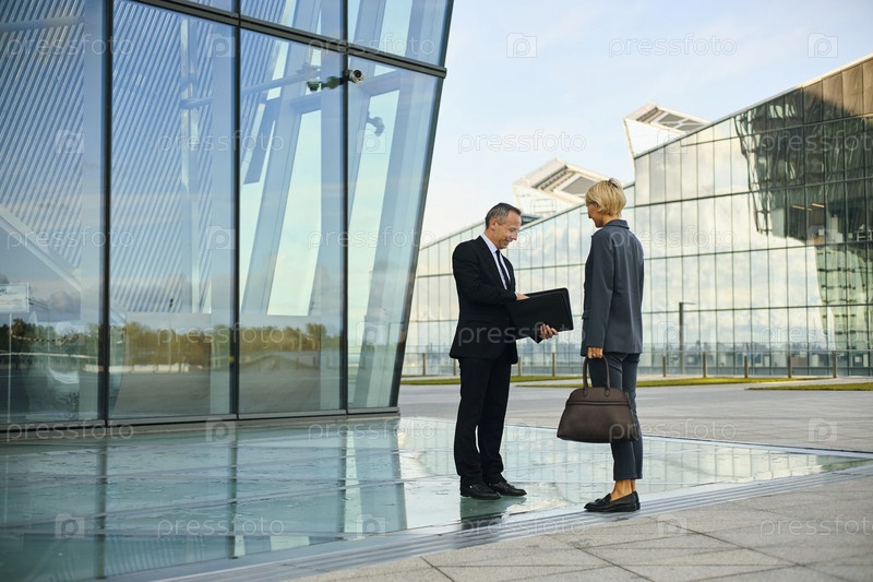 Бизнесмен среднего возраста приветствует коллегу-женщину на улице