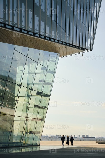 Группа молодых профессионалов, гуляющих за пределами высокого стеклянного офисного здания
