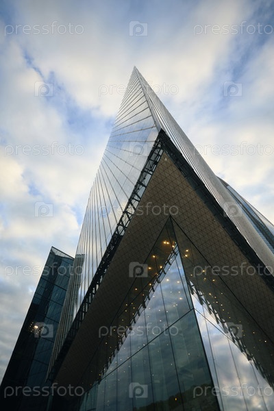 Стеклянный небоскреб, отражающий небо и облака в современном городском ландшафте