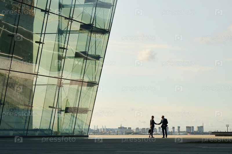 Два бизнесмена пожали друг другу руки возле современного стеклянного здания