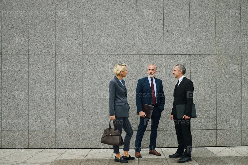 Три бизнесмена среднего возраста, стоящие и разговаривающие на открытом воздухе
