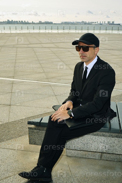 Бизнесмен в костюме, солнцезащитных очках и шапке сидит на открытом воздухе возле набережной